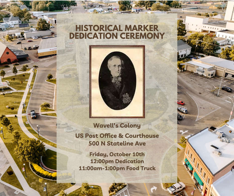The City of Texarkana, Texas will host a dedication ceremony Friday, October 10th at noon to unveil the replacement of the Wavell’s Colony historical marker near the downtown Post Office and Courthouse.